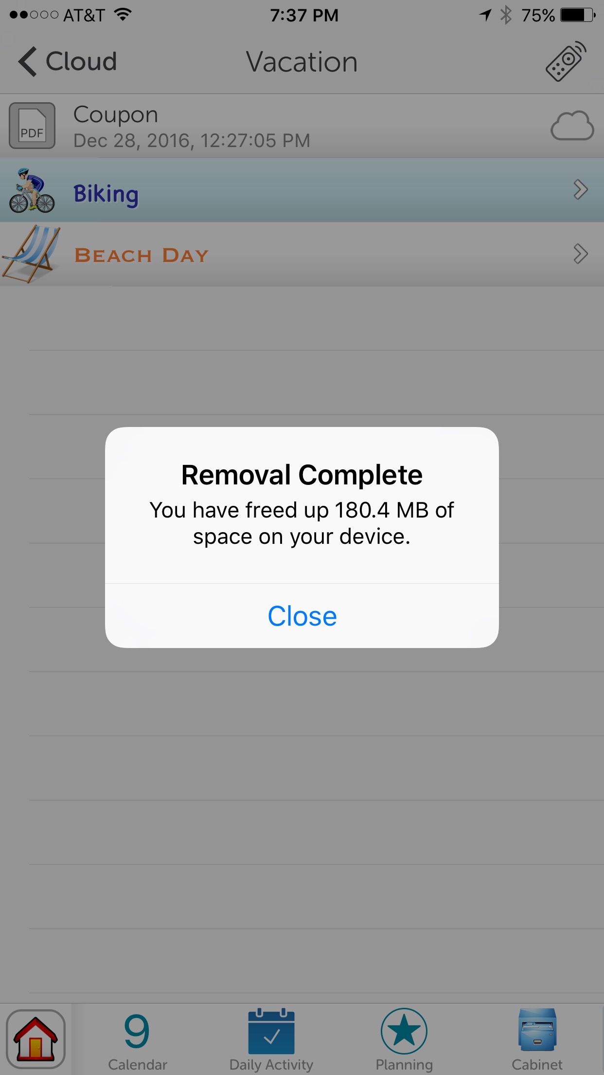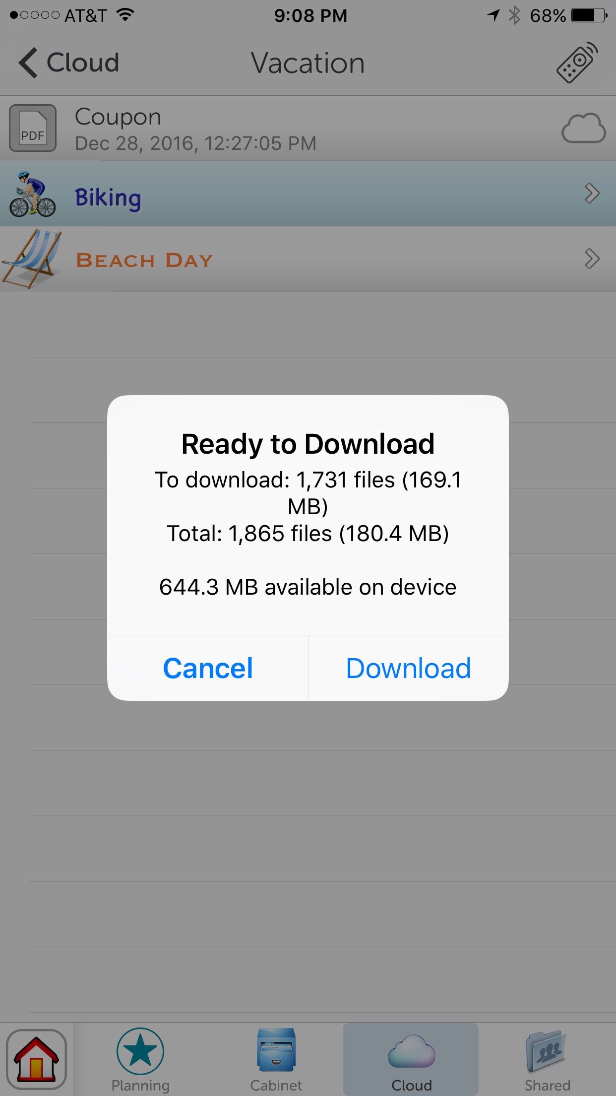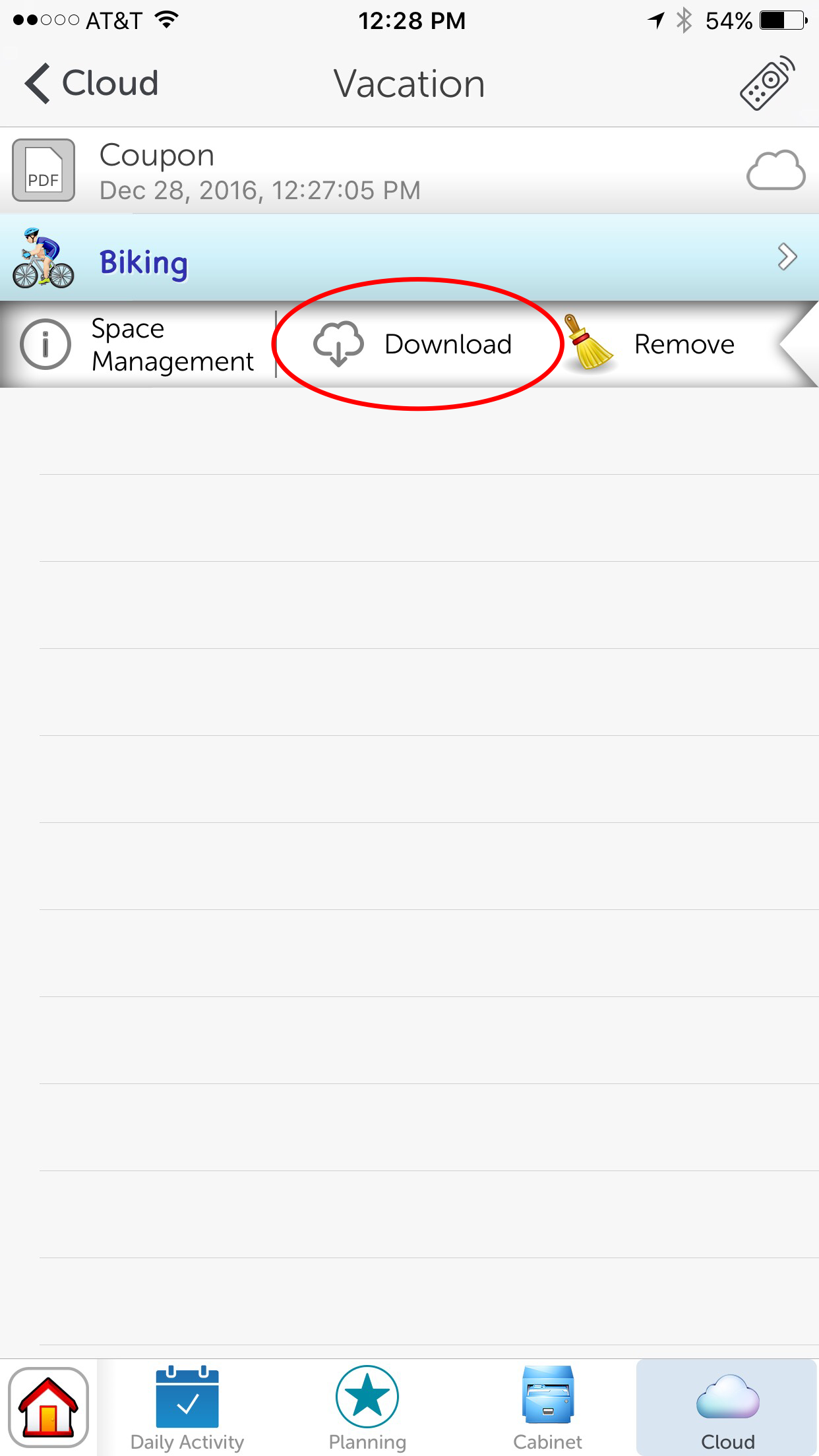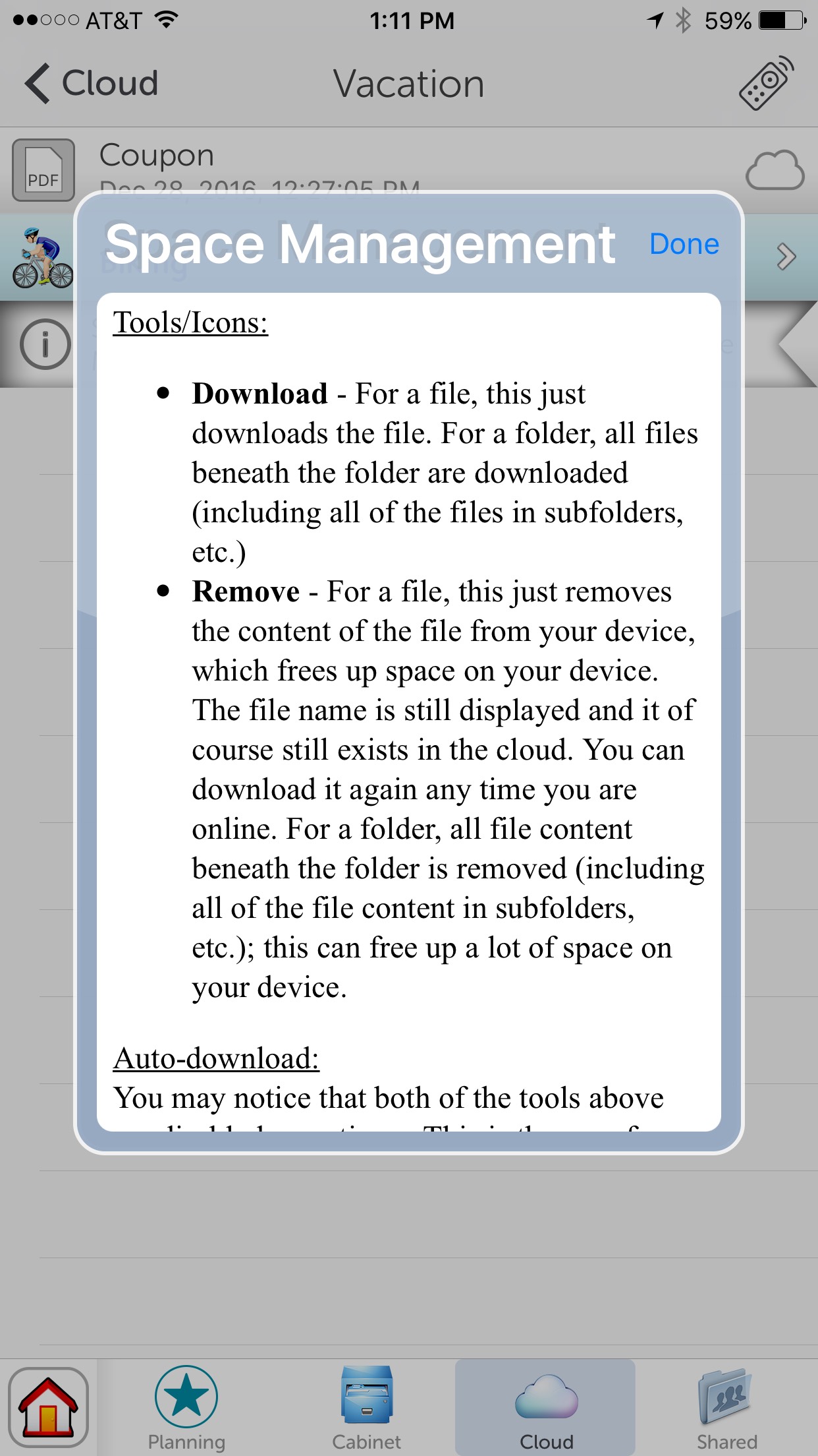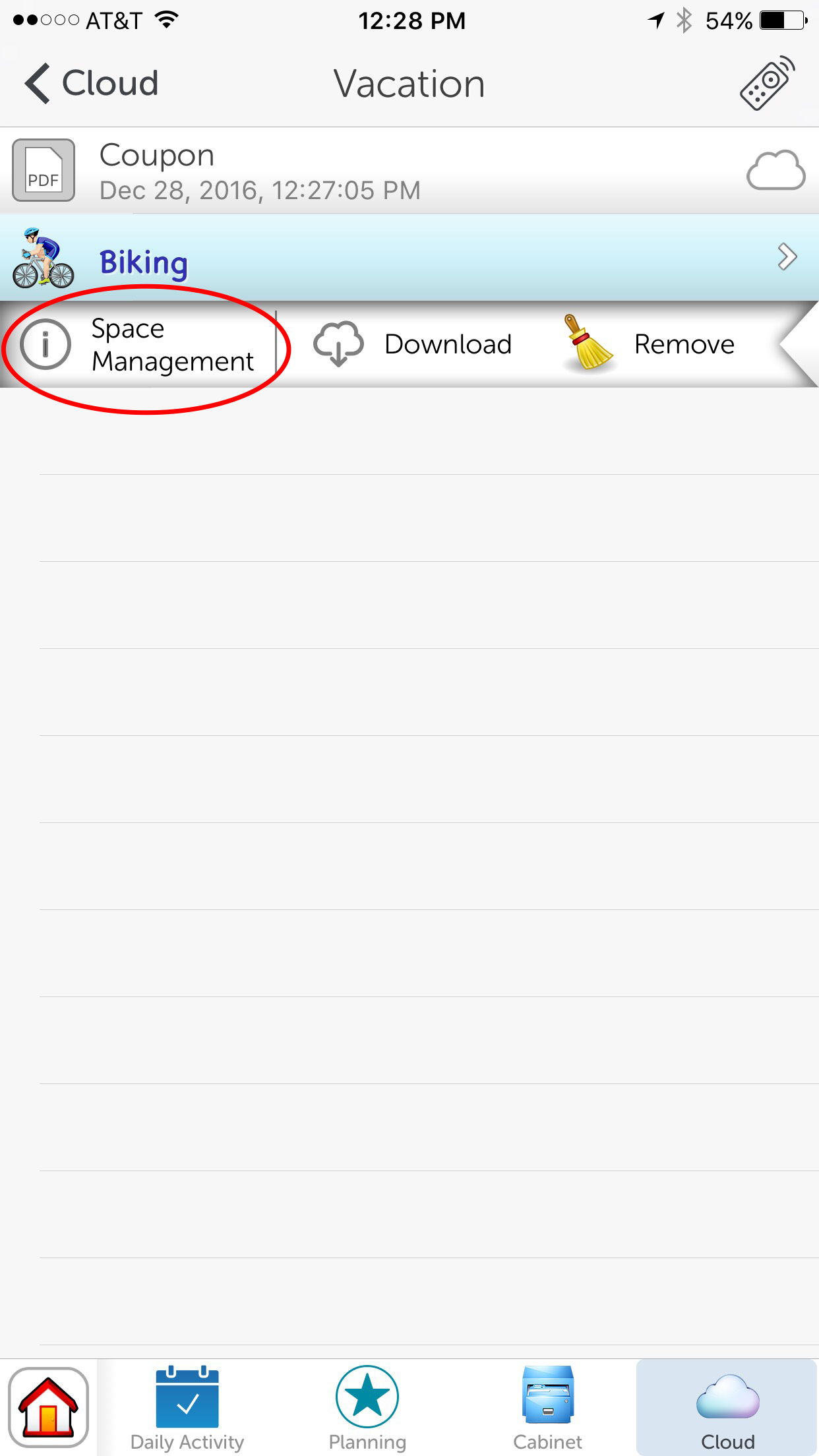 It is very convenient to have all of your Cloud/Dropbox files downloaded to your device so that you have access to them even when offline. However, you may not want a lot of disk space taken up on your device because it is getting full or it is just too limited, etc. Most of the time, you don't even have to worry about it but if you do want to manage this yourself a bit, the Space Management feature in iStratus® DayPlanner can really help you out.